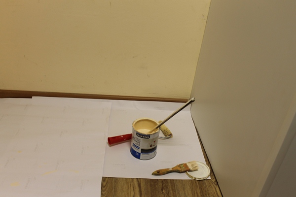 Хотя стены в подсобном помещении были в неплохом состоянии, но освежить стены всё-таки надо было. В магазине Леруа Мерлен мы купили необходимые нам материалы и инструменты для ремонта стен и монтажа стендов. Краску на водной основе для стен кухни и ванной Luxens мы купили 1 литровую банку.