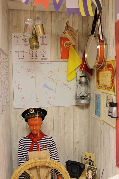 Во время экскурсии объясняю, что означает каждый флаг. На стене почётные грамоты, которые давали пионерам в советское время. Мне захотелось, чтобы за штурвалом находился Тимур, поэтому приобрели манекен.