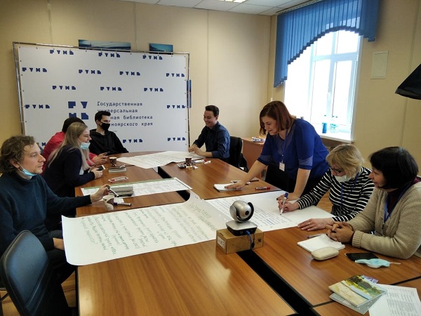 В работе онлайн-форсайта одновременно работали пять групп, в каждой группе были представители библиотек, предприниматели, журналисты, научные сотрудники, общественные деятели, студенты из разных регионов России. 25 февраля я работала в группе № 2, которая состояла из 13 человек, а 26 февраля в группе № 1.