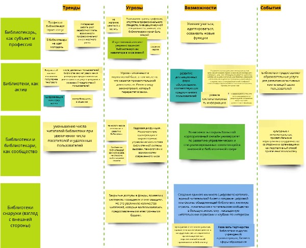 Сначала мы заполняли с помощью специальной программы карточки, в которых писали своё видение, зачем и кому нужна библиотека, какой мы её видим в будущем, библиотекарь, как субъект и профессия, как актив, библиотеки снаружи (взгляд с внешней стороны), также отвечали на другие вопросы. Затем шло обсуждение, в итоге кто-нибудь из группы должен был высказать за 2−3 минуты мнение группы на поставленные вопросы.