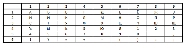 Каждый символ будет шифроваться опять двумя цифрами, причём первой может быть как номер столбца, так и номер строки. То есть буква «К» может быть зашифрована, как 32 или 23.