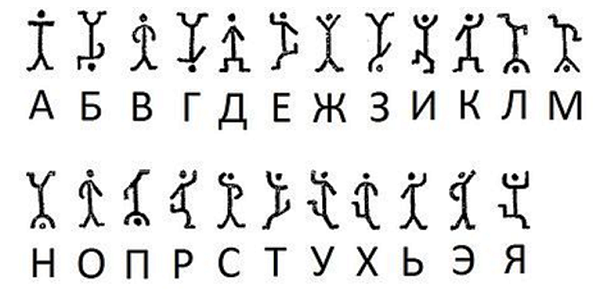 Наверно большинству знаком этот шифр из рассказа Артура Конана Дойля. Существуют и другие похожие шифры, но смысл там один — каждая буква изображается каким-то своим знаком (рисунком). Здесь обычно нет какого-то четкого алгоритма зашифровки символов.