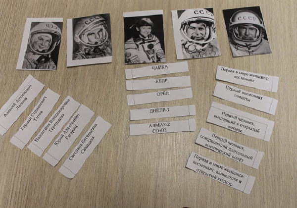 Ведущий. Перед вами фотографии космонавтов, которые были первыми в различных полетах. Вам надо подобрать к ним ФИО, их позывные, подвиг, который они совершили первые.