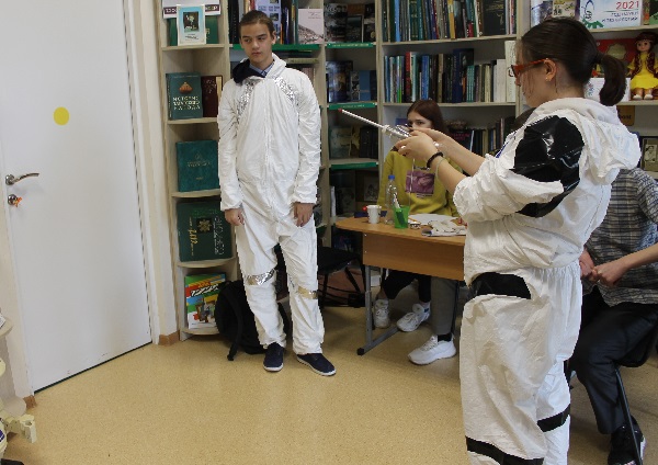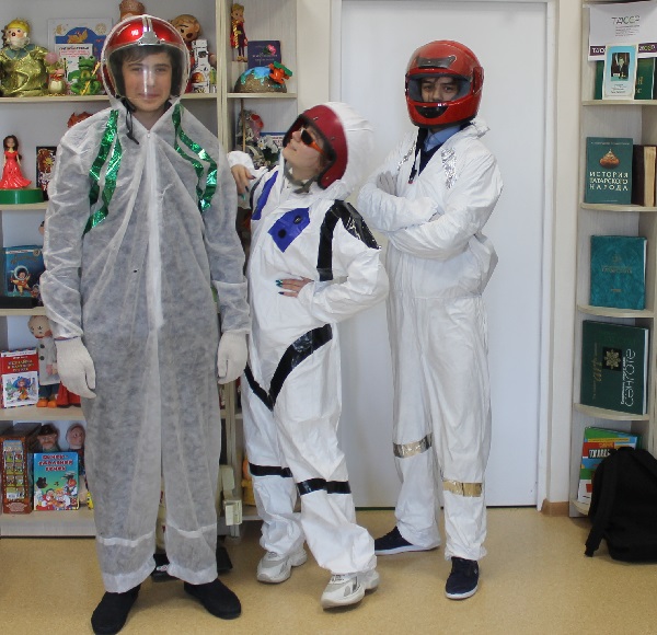 После того как команды выбрали своего капитана, ведущий объявляет названия планет и называет капитанов команд. Затем капитаны выходят в другую комнату, где они одевают «скафандры» и каски. У нас скафандрами были строительные и медицинские комбинезоны, украсить их можно полосками самоклеящейся бумаги. На голову наши «космонавты» надели мотоциклетные каски.